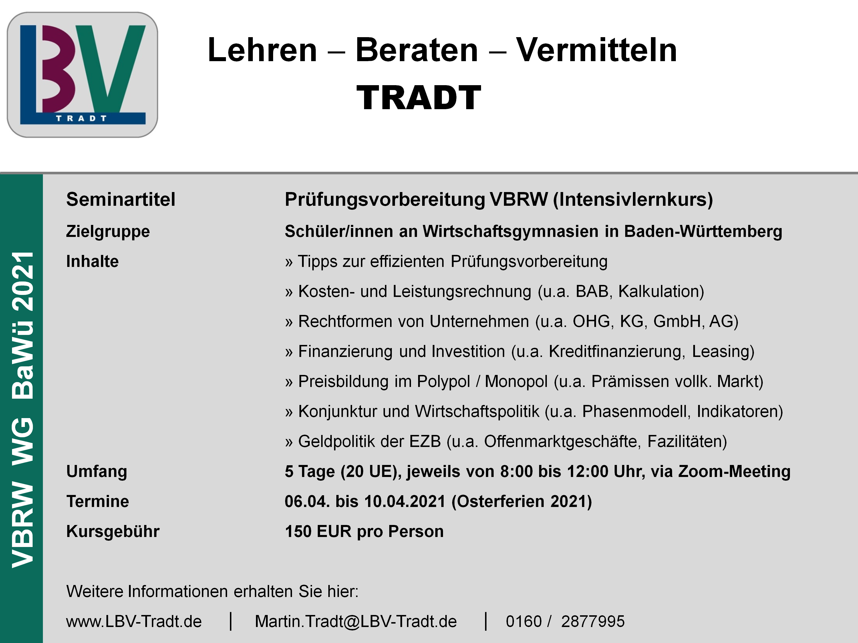 Die Firma LBV Tradt bietet seit 2011 Intensivlernkurse zur Vorbereitung auf die schriftliche Abiturprüfung im Fach Wirtschaft (VBRW) an Wirtschaftsgymnasien in Baden-Württemberg an.