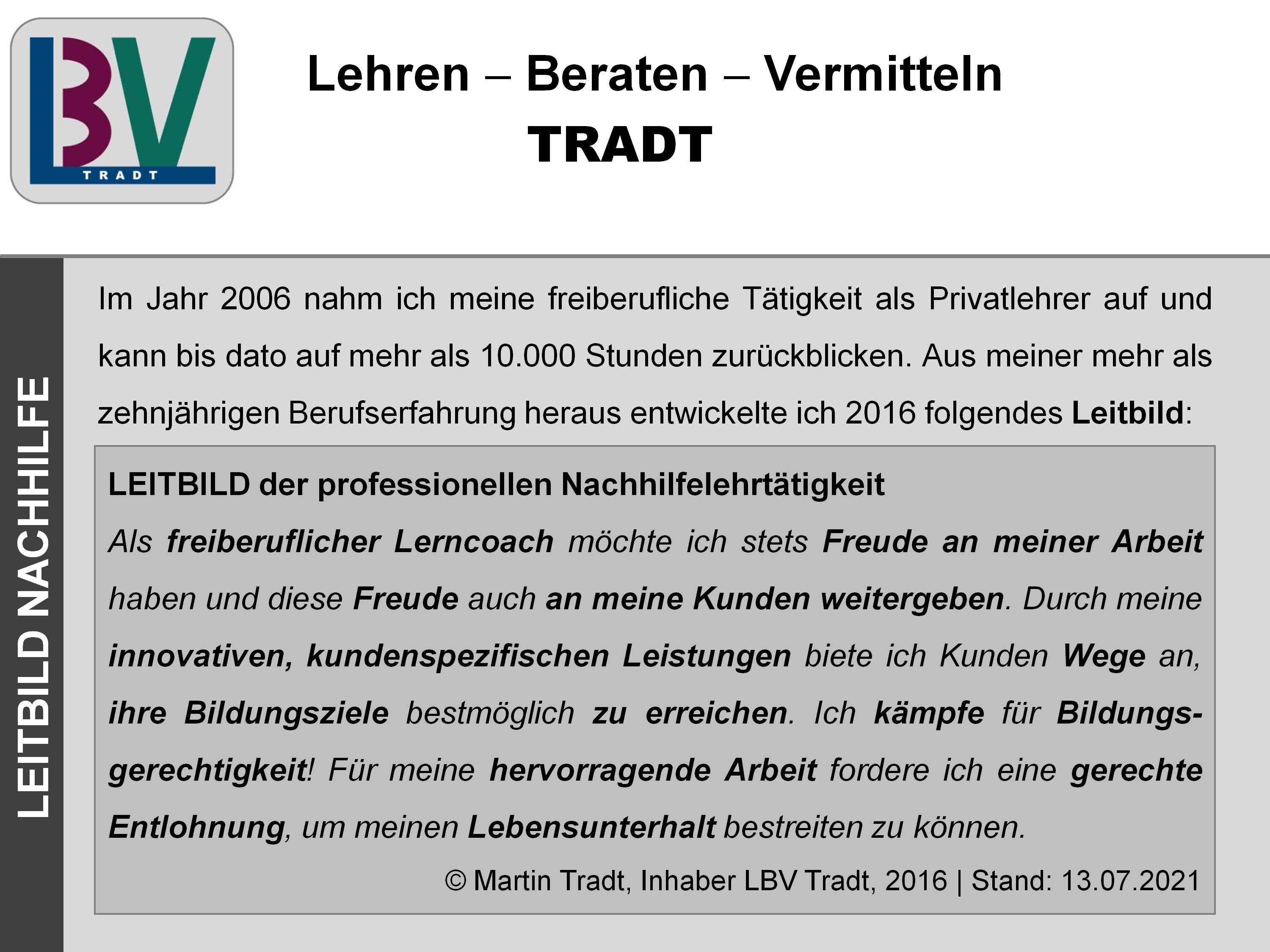 Seit November 2006 ist Herr Tradt als Privat- bzw. Nachhilfelehrer tätig. Herr Tradt hat seither mehr als 9.000 Stunden professionelle Nachhilfe erbracht. Die Nachhilfe wird direkt beim Kunden vorort geleistet und zeichnt sich durch eine hohe Individualität und zeitliche Flexibilität aus.